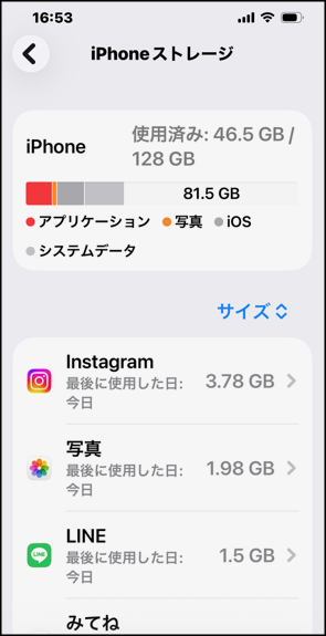 ちなみに妻のスマホのiphoneストレージはというと128GBのうち46.5GBしか使っていません。