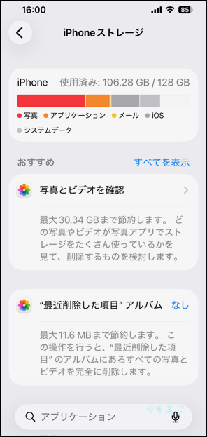私のスマホで、こちらを見ると、全容量128GB中使用済みが106GBとなっているのでまだ余裕ですよ!