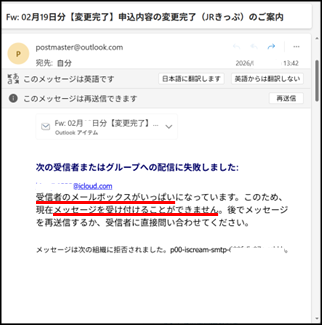 <受信者のメールボックスがいっぱいになってるので、受け付けることができない>